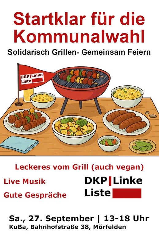 Neben der Arbeit im Stadtparlament und ihrer außerparlamentarischen Begleitung bereitet sich die DKP/Linke Liste zurzeit auf die Kommunalwahl am 15. März 2026 vor. Zu dieser Kommunalwahl wollen wir in unserer Stadt wieder  einen Wahlvorschlag als Wählergemeinschaft mit der Bezeichnung DKP/Linke Liste (DKP/LL) einreichen, der für Mitglieder unterschiedlicher linker Parteien und parteilose Linke offen ist. Am Samstag, den 27. September 2025, wollen wir von 13 – 18 Uhr im Mörfelder Kulturbahnhof im lockeren Rahmen mit möglichst vielen Kandidat*innen und Unterstützer*innen über unser Programm reden – das im Vorbereitung